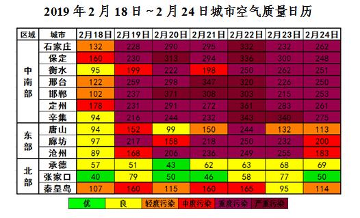 上周(2019年2月18日~2月24日),2月18日,整体扩散条件一般,我省大部以良至轻度污染为主;19~24日,我省北部张家口和承德市,受西北弱冷空气扰动影响,以优良为主,秦皇岛市扩散条件一般,以轻度至中度污染为主;中南部和东部扩散条件持续不利,以重度及以上污染水平为主。邯郸出现3天严重污染,保定、邢台、辛集各出现2天严重污染,石家庄、定州各出现1天严重污染。