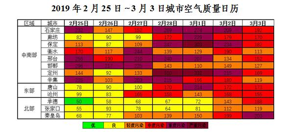 上周(2019年2月25日~3月3日),我省扩散条件不利,北部以良至轻度污染为主,部分城市出现中至重度污染;中南部、东部以中至重度污染为主;定州出现2天严重污染,保定出现1天严重污染。