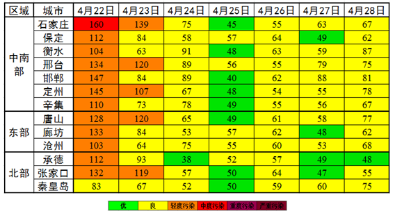 上周(2019年4月22日~4月28日),4月22~23日,受地面高湿、小风影响,扩散条件一般,我省大部空气质量以良至轻度污染为主,石家庄出现1天中度污染;24~28日,受冷空气和降水过程影响,扩散条件整体较好,全省空气质量为优良。