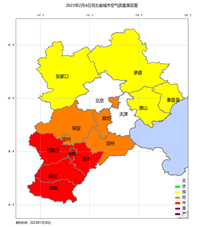 2月6日(下周一),高空为平直西风,地面转高压底部。张家口、承德受西北风影响,空气质量以优良为主;秦皇岛、唐山白天受东北风影响,风力较强,湿度偏低,以良至轻度污染为主;廊坊、保定、沧州受偏东北风、东风影响,早晚湿度70%,空气质量以轻度至中度污染为主;其他城市处于风场辐合中心,湿度80%以上,受南北风辐合和高湿影响,污染持续累积,空气质量以中度至重度污染为主,首要污染物PM2.5。